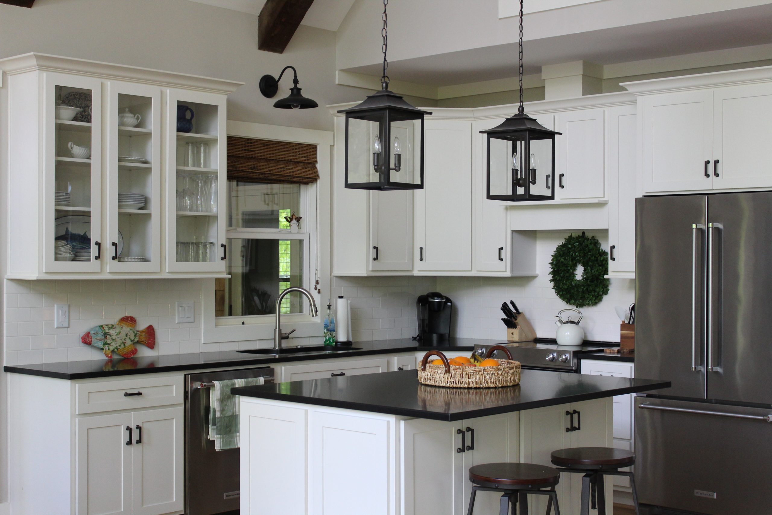 The pendant lights over the kitchen island are in vogue with the rustic but modern look.