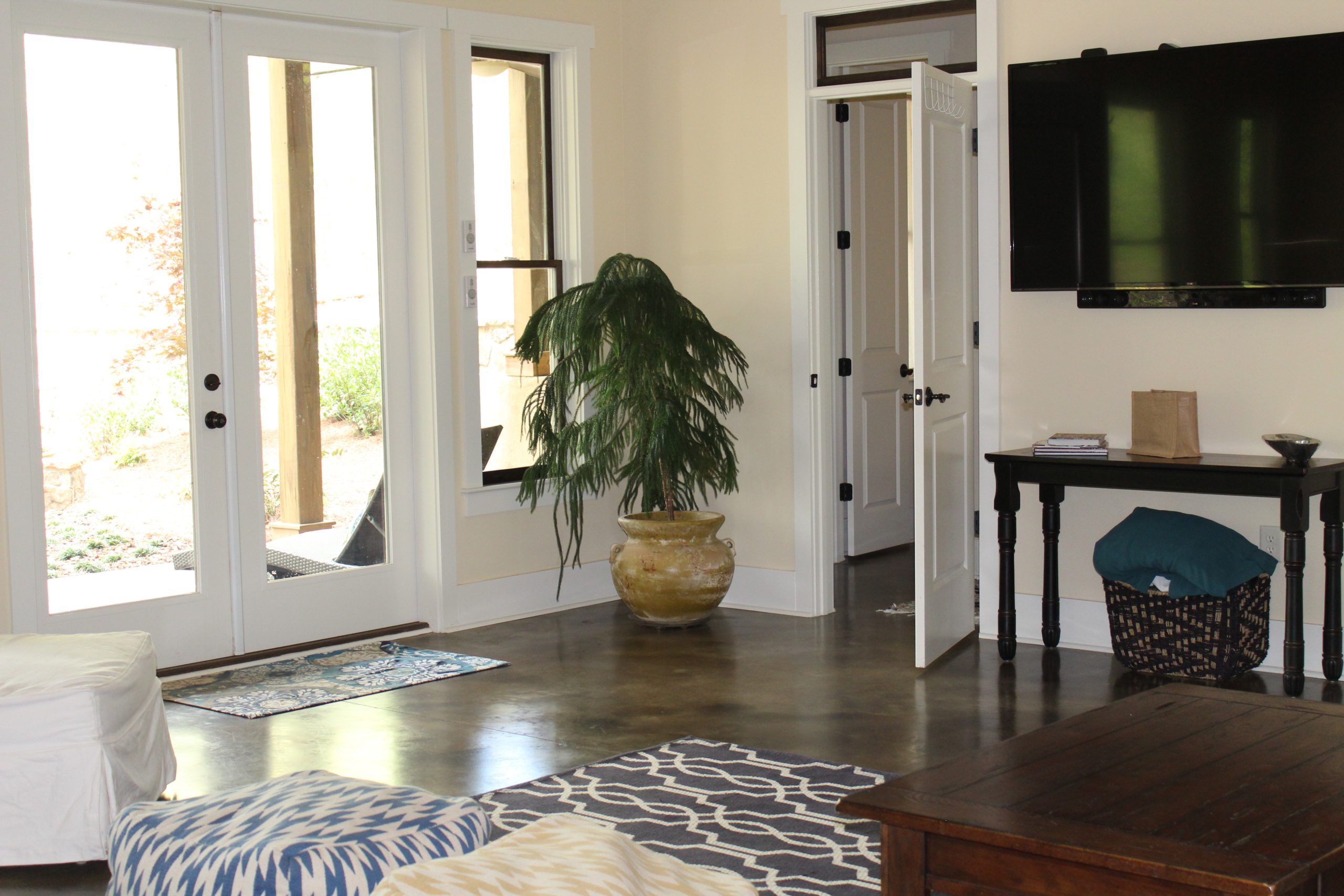 The glass french doors in the walk out basement offer a great view of the lake and access to the patio.