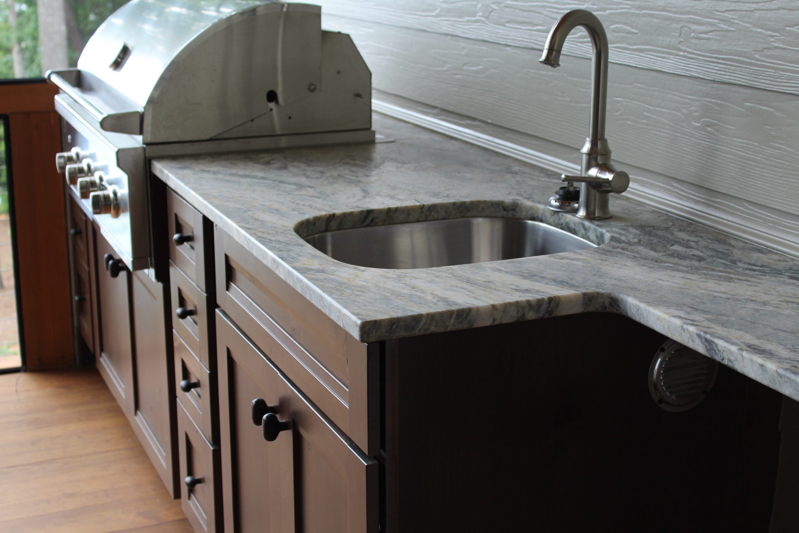 The rustic wooden cabinetry is topped by a creamy gray granite countertop.